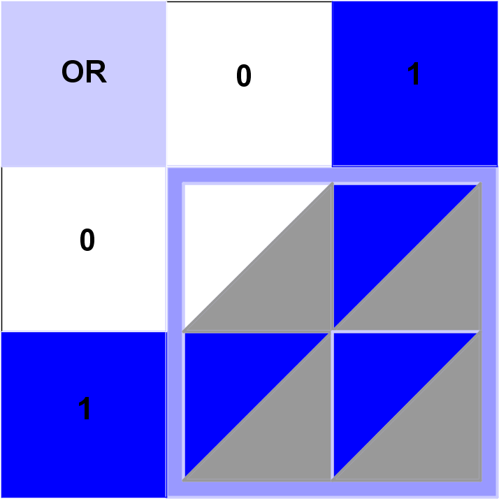of OR in the top-left corner with appropriate colour. The logo of TSVJoR was synthesised by amalgamating into a single image the relevant fragments of the truth tables showing the results of the two operations.